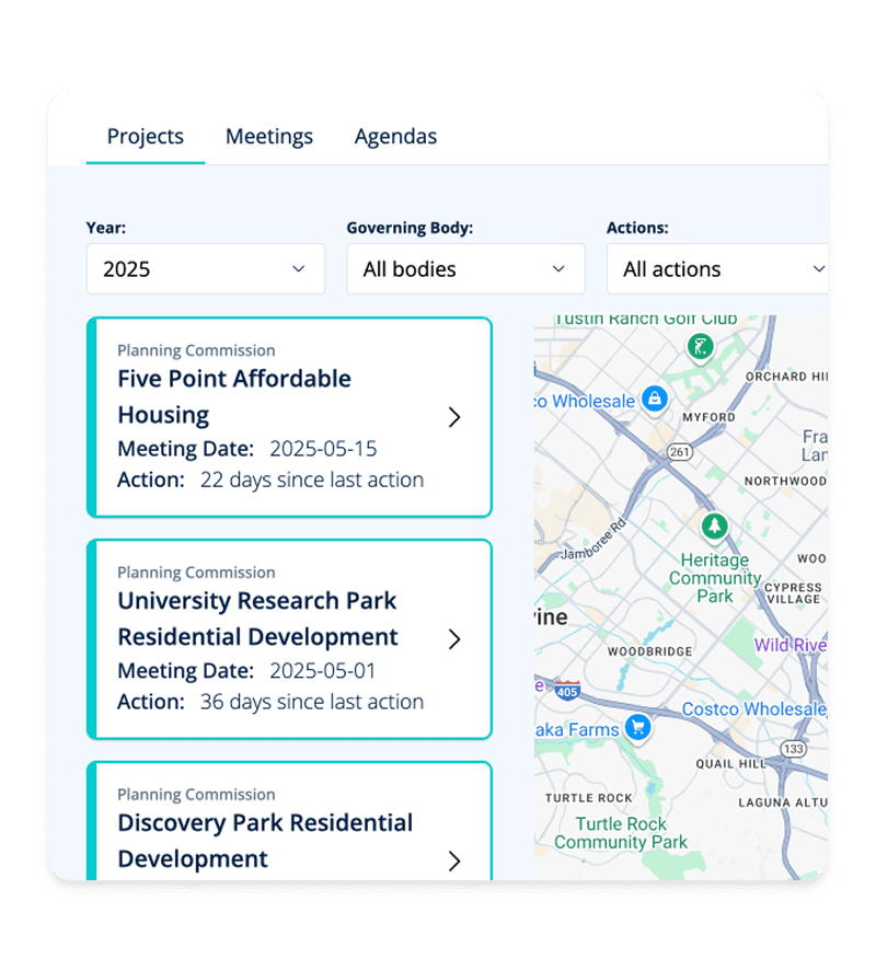 Choose from hundreds of US jurisdictions or request custom coverage. Monitor cities, counties, commissions, and other local bodies that affect your business.