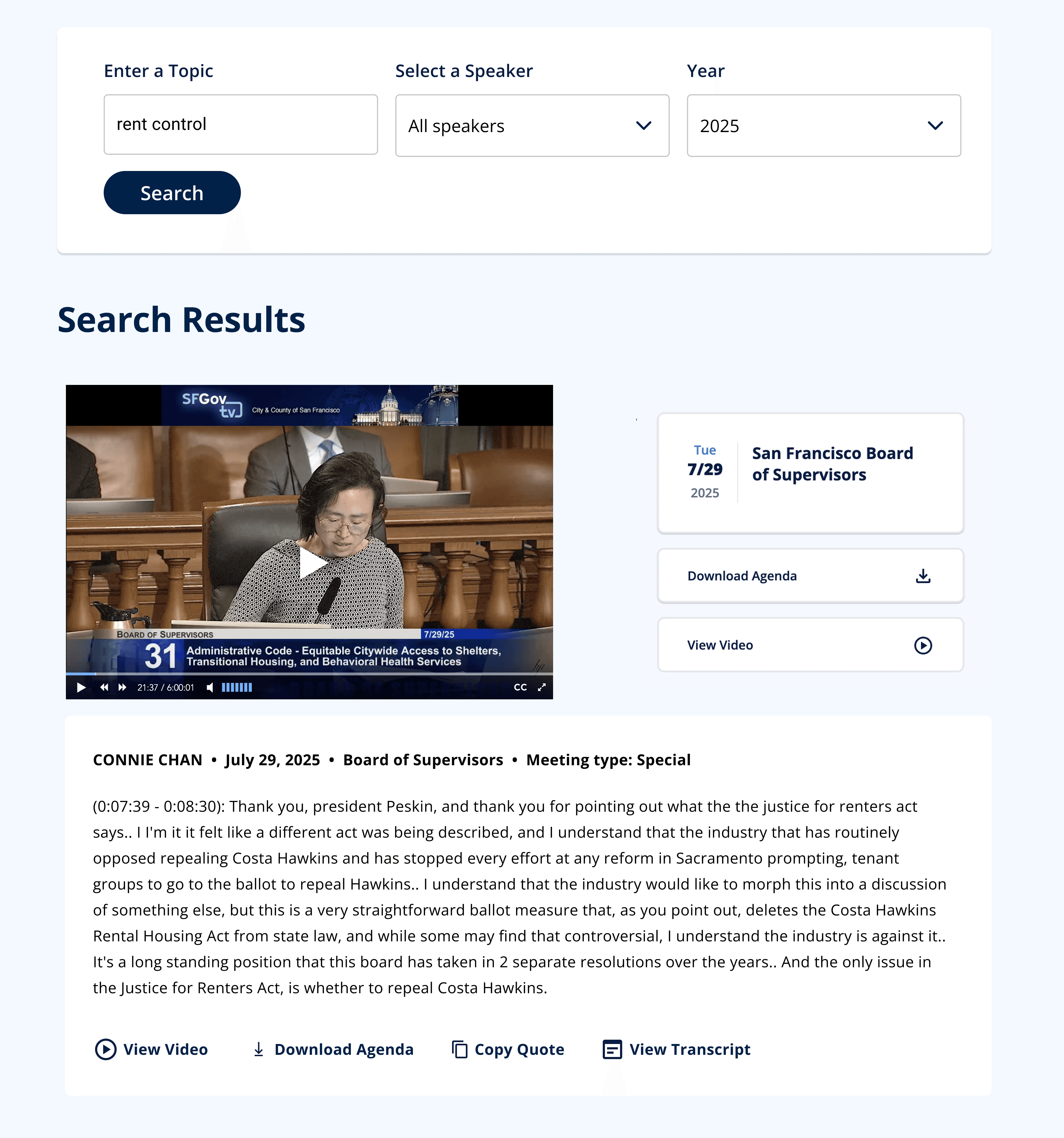 Historical intelligence platform that lets you search years of meeting archives for specific quotes, topics, and discussions across all your covered jurisdictions.