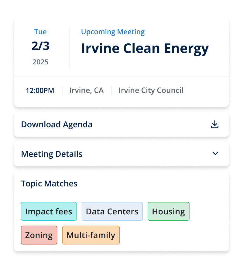 Advanced intelligence alerts that notify your team the moment agendas are posted, so you can decide whether to attend meetings or take strategic action.
